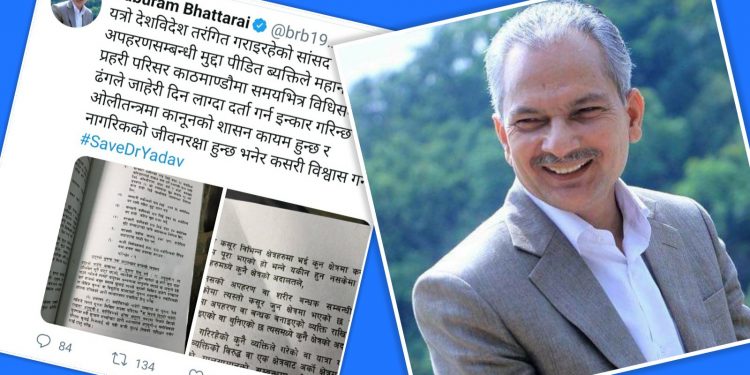 पार्टीका नेता एवं पूर्वप्रधानमन्त्री बाबुराम भट्टराईले पनि ‘यत्रो देशविदेश तरंगीत गराइरहेको सांसद अपहरणसम्बन्धी मुद्दा पीडित व्यक्तिले महानगरीय प्रहरी परिसरमा समयभित्र विधिसम्मत ढंगले जाहेरी दनि लाग्दा दर्ता गन्न इन्कार गरिन्छ भने ओलीतन्त्रमा कानूनको शासन कायम हुन्छ र नागरिकको जीवनरक्षा हुन्छ भनेर कसरी विश्वास गर्ने?’ भनी ट्विट गरेका छन्।