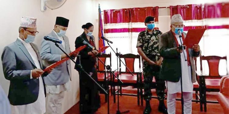 नवनियुक्त उद्योग, वन, पर्यटन तथा वातावरण मन्त्री सरेश नेपाल, सामाजिक विकास मन्त्री सरस्वती वस्नेत, आन्तरिक मामिला तथा कानूनमन्त्री केशव पाण्डे, सामाजिक विकास राज्यमन्त्रीमा डा.रामकुमार अधिकारीले पद तथा गोपनीयताको सपथ लिएका छन् ।