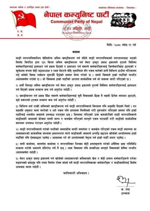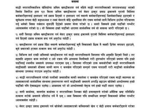 पार्टीको धारणा सार्वजनिक गर्न जारी गरेको भनिएको उक्त विज्ञप्तिमा सयौँ बिगाहा जमिन खण्डिकरण गर्न मेयर ढकालले कर्मचारीलाई हस्ताक्षर गर्न दिएको दबाब तत्काल रोक्न अनुरोध गरिएको छ ।