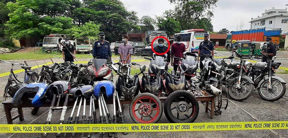 प्रहरीले बुलेट मोटरसाईकल २ थान, २२० सीसीको पल्सर मोटरसाईकल २ थान, एनएस पल्सर १ थान तथा नम्बर प्लेटमा लेमिनेशन गरि वास्तिवक भन्दा फरक नम्बरहरु लेखिएका ना२प २६५४ र ना२२प ६०६६ मोटरसाईकलका २ थान भाइजर बरामद गरेको थियो ।त्यसैगरी प्रहरीले मोटरसाइकल चोरी तथा तथा खोल्न प्रयोग गरिने बिभिन्न सामाग्रीहरू बरामद गरेको थियो ।