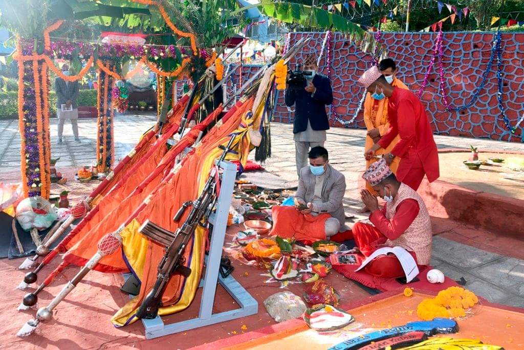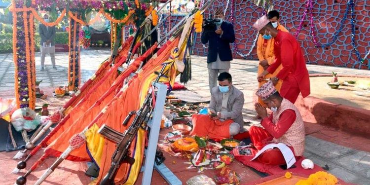सशस्त्र प्रहरी व्याण्डको मंगलधुनबीच सुरु भएको पुजा कार्यक्रममा सशस्त्र प्रहरी बल, नेपालको एक टोलीले निशान भगवती सलामी अर्पण गरेको थियो ।
