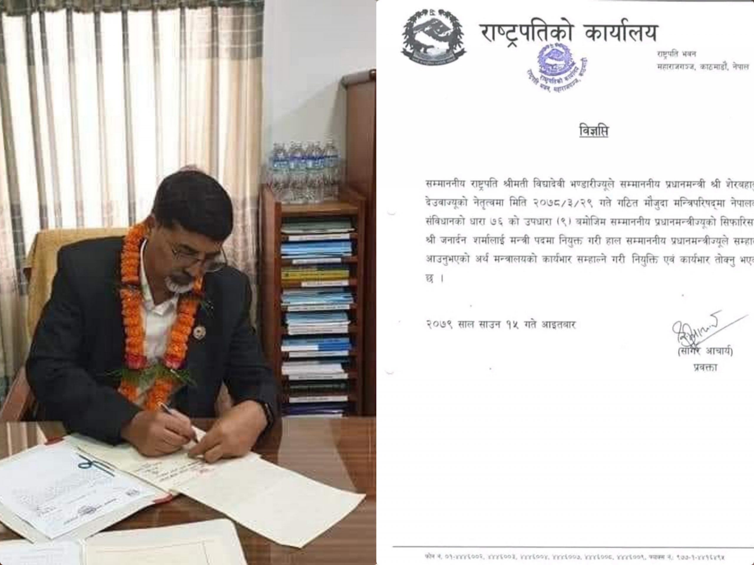 काठमाडौं । बजेट प्रकरणमा निर्दोष साबित भएका तत्कालीन अर्थमन्त्री जनार्दन शर्मा पुनः अर्थमन्त्रीमा नियुक्त भएका छन् । आइतबार प्रधानमन्त्री शेरबहादुर देउवाको सिफारिसमा उनलाई राष्ट्रपति विद्यादेवी भण्डारीले अर्थ मन्त्रालयको जिम्मेवारी सम्हाल्ने गरी मन्त्री नियुक्त गरेको राष्ट्रपति कार्यालयले जनाएको हो ।