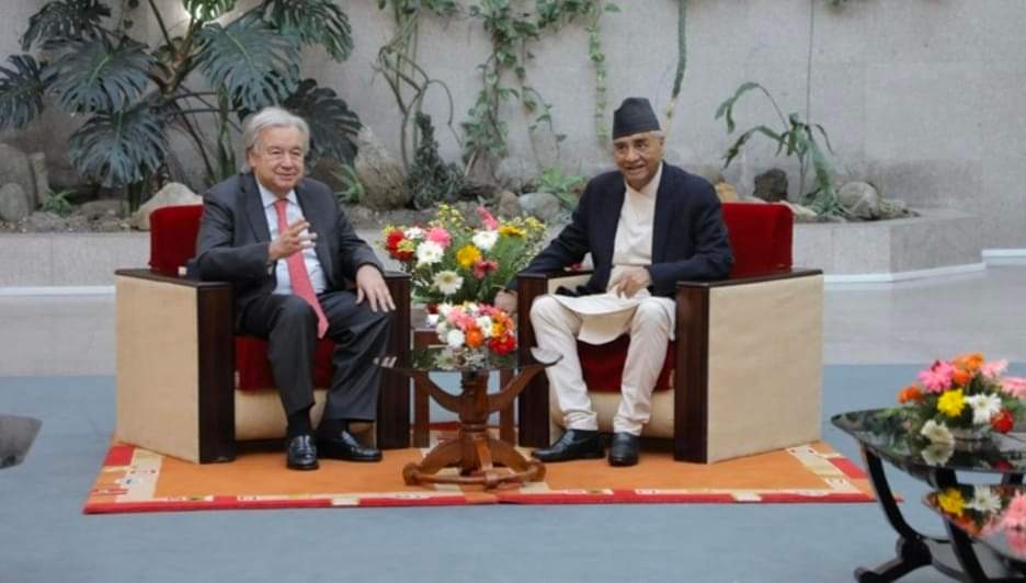 काठमाडौं । चार दिने औपचारिक नेपाल भ्रमणमा आएका संयुक्त राष्ट्रसंघका महासचिव एन्टिनियो गुटरेस र नेपाली कांग्रेसका सभापति शेरबहादुर देउवाबीच भेटवार्ता भएको छ ।